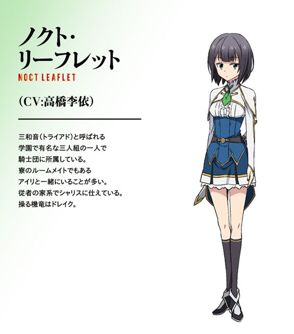 เด็กสาวนักเรียนปีสาม เธอเป็นหนึ่งในสามสาวTriads ร่วมกันกับน็อคท์และทิลฟัวล์ คุณพ่อของเธอทำงานฐานะผู้ช่วยผู้บัญชาการทหารของกองทัพของอาณาจักรอาทิสมาต้า ทั้งตัวเธอยังมีคู่หมั่นหมายที่ต้องแต่งงานอยู่ด้วย เป็นรูมเมทของเซลิสเทีย มีดรากูลประจำตัวคือ “ไวเวิร์น” (ワイバーン)