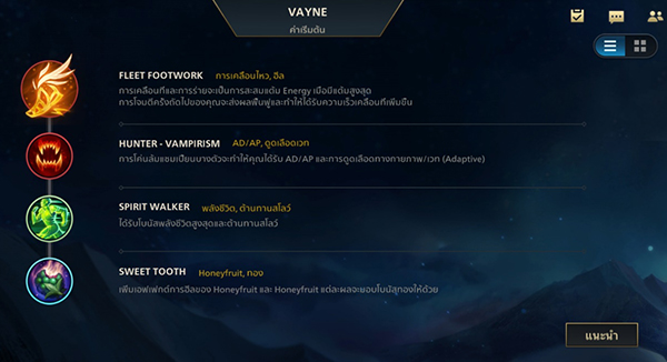 Vayne ผู้ออกล่าเหล่าปีศาจที่ชั่วช้าจะได้รับความเร็วในการเคลื่อนที่เพิ่มขึ้น 30 หน่วยเมื่อวิ่งเข้าหาแชมเปี้ยนฝ่ายศัตรู