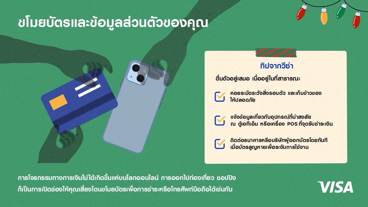 ทิปจากวีซ่า: เมื่อต้องอยู่ในที่สาธารณะ ให้คอยระมัดระวังสิ่งรอบตัว และเก็บข้าวของให้ปลอดภัย แจ้งข้อมูลเกี่ยวกับอุปกรณ์ที่น่าสงสัย ณ ตู้เอทีเอ็ม หรือเครื่อง POS ที่จุดรับชำระเงินที่ได้รับอนุญาต ในกรณีที่ทำบัตรสูญหายให้ติดต่อธนาคารหรือบริษัทผู้ออกบัตรโดยทันที หรือให้แจ้งระงับข้อมูลสำคัญในการชำระเงินของคุณผ่านทางแอปโมบายแบงก์กิ้งเพื่อป้องกันค่าใช้จ่ายไม่พึงประสงค์