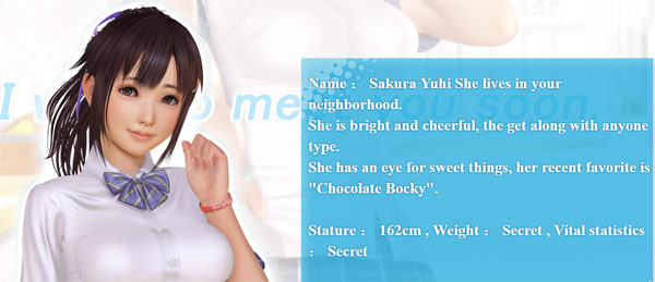 “ยูฮิ ซากุระ” สาวน้อยวัยใสข้างบ้าน จัดเป็นสาวรายแรกที่ปรากฎตัวให้ผู้เล่นได้ใจเต้น กับท่าทางแบ๊วๆแบบอนิเมญี่ปุ่นที่ทำเอาจินตนาการกระเจิงด้วยความสดใส ไร้เดียงสา น่าถนอม ที่มาพร้อมกับ “ไฟหน้า” ขนาดกำลังเหมาะมือ!? และเชื่อว่าจะไม่จบแค่รายนี้รายเดียว ตามสูตร “Illusion Harem” ครับ
