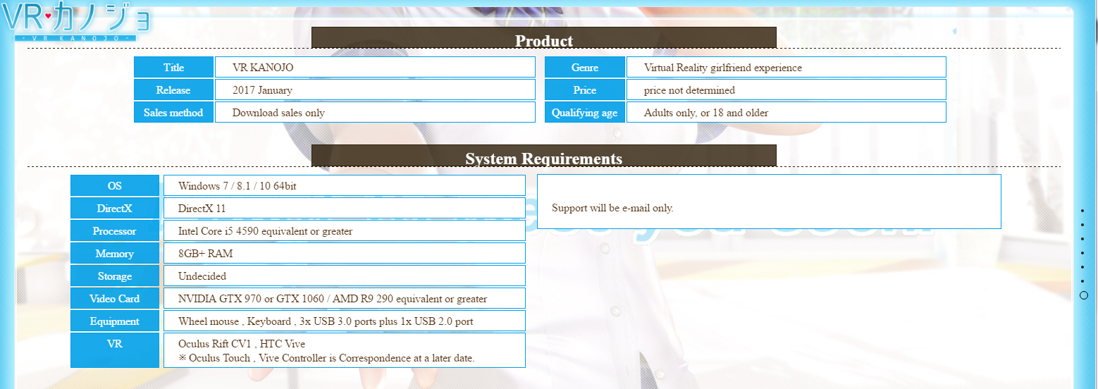 แต่กับ PC นั้นเป็นด้านตรงกันข้าม เพราะมีทีมพัฒนาเจ้าประจำ“Illusion” ที่ขยันทำเกมแนว CG 18+ ภาพสวยๆสำหรับผู้ใหญ่ ออกมาแทบจะทุกปี และตอนนี้ ทีมพัฒนาดังกล่าวก็ขอโดดร่วมวงทำเกม VR บ้าง กับเกมที่ชื่อว่า VR Kanojo