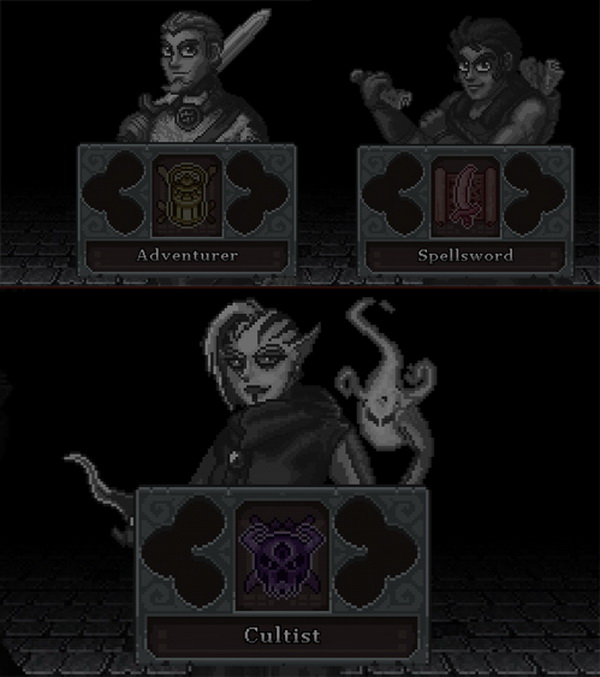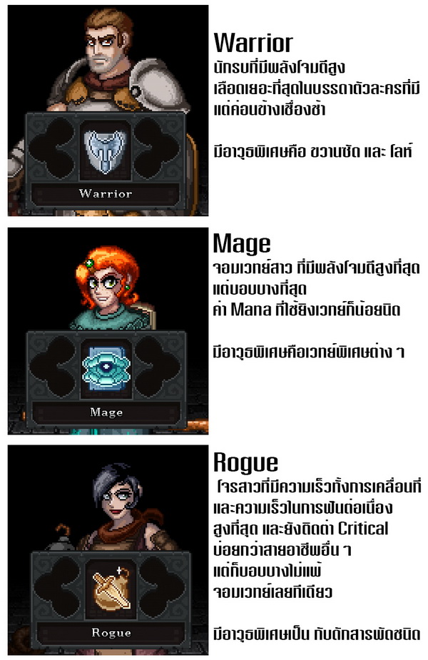 ในการเล่นเกมนี้ ผู้เล่นสามารถเลือกตัวละครที่แตกต่างกันเพียง3อาชีพ ได้แก่ นักรบ จอมเวทย์ และ โจร ครับ ซึ่งถ้าเล่นจบเนื้อเรื่องของตัวละครใดตัวละครหนึ่ง ก็จะสามารถปลดล๊อกสายอาชีพอื่นๆอีกสามสายที่เหลือได้ครับ ซึ่งการอัพเกรดความสามารถ จะเป้นการใช้เหรียญทองร่วมกัน เช่นเราเล่น Warrior ให้เก่ง แล้วเราก็เอาเหรียญที่ได้ ไปอัพกรดจอมเวทย์ในการเล่นรอบต่อไปก็ได้ครับ