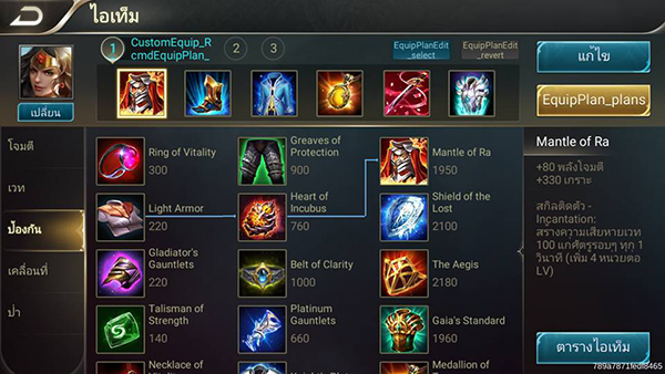 ในส่วนการออกของนั้นจะเน้นเพื่อให้ยืนกลางวงไฟต์ได้นานและเก็บคิลได้ด้วย โดยชิ้นแรกคือ Mantle of Ra โจมตีแรงขึ้นและเสริมเกราะ ต่อด้วยรองเท้า Gilded Greave ป้องกันสถานะเผื่อหนีออกมาตั้งหลัก Frost Capeเพื่อตามคิลได้ง่ายขึ้น สุดท้ายเสริมความแกร่งด้วย Medallion of Troy + Muramasa + Ancestral Glory ซึ่งการออกของตามนี้จะช่วยให้เปิดทีมไฟต์ได้ดี ออกสกิลได้ต่อเนื่อง และไล่เก็บคิลได้ง่ายขึ้น