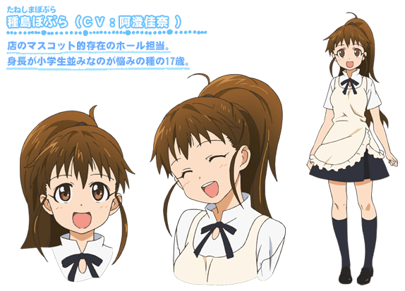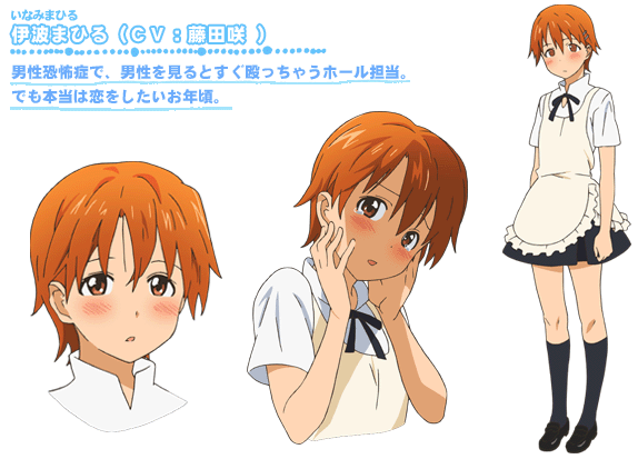 เด็กสาวขี้อายและเป็นโรคกลัวผู้ชายเป็นชีวิตจิตใจ อยู่ชั้น ม.ปลาย ปีที่ 2 รุ่นเดียวกันกับ “ทาเนชิมะ โปปุร่า” แต่เรียนอยู่โรงเรียนหญิงล้วน และมักปล่อยหมัดใส่ผู้ชายเสมอ โดยเฉพาะโซตะ แต่เขาก็คือผู้ชายคนเดียวที่เธอเข้าใกล้ได้มากที่สุด แม้เธอจะมีปัญหากับการบริการลูกค้าที่เป็นผู้ชาย แต่สำหรับลูกค้าที่เป็นผู้หญิงแล้ว เธอสามารถบริการได้อย่างดีเยี่ยมเลยที่เดียว