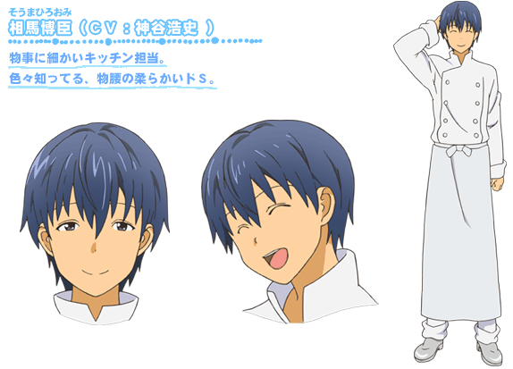เชฟอีกคนหนึ่งภายในร้านอาหารแห่งนี้ เป็นคนอัธยาศัยดี พูดเก่ง เหมือนเป็นหนุ่มโลกสวยธรรมดาๆ ที่ไร้พิษภัย แต่กลับมักชอบแอบสืบความลับของทุกคนที่เขาสามารถพูดคุยด้วยได้ เพื่อใช้แบล็คเมล์และเอามาข่มขู่ให้คนอื่นทำงานเล็กๆน้อยแทนเขา แต่ “อินามิ มาฮิรุ” กลับเป็นเด็กสาวคนเดียวที่เขากลัวมากที่สุด เพราะไม่สามารถหาโอกาสพูดคุยก่อนเธออกหมัดซัดเขาได้สักครั้ง