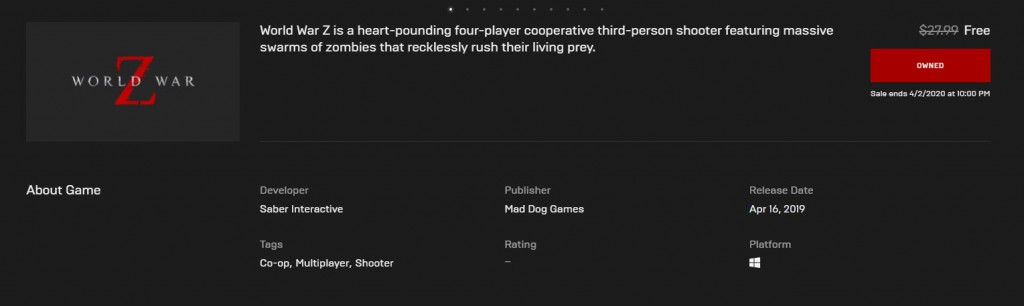 ใครที่อยู่บ้าน ว่างๆในช่วงไวรัสโคโรนาระบาด แล้วเหงาๆเซ็งๆ ก็เปิดคอม แล้วไปที่ Epic Games Store เกม World War Z เปิดให้โหลดฟรี ตั้งแต่วันนี้ ถึง วันที่ 2 เมษายน 2020เท่านั้น