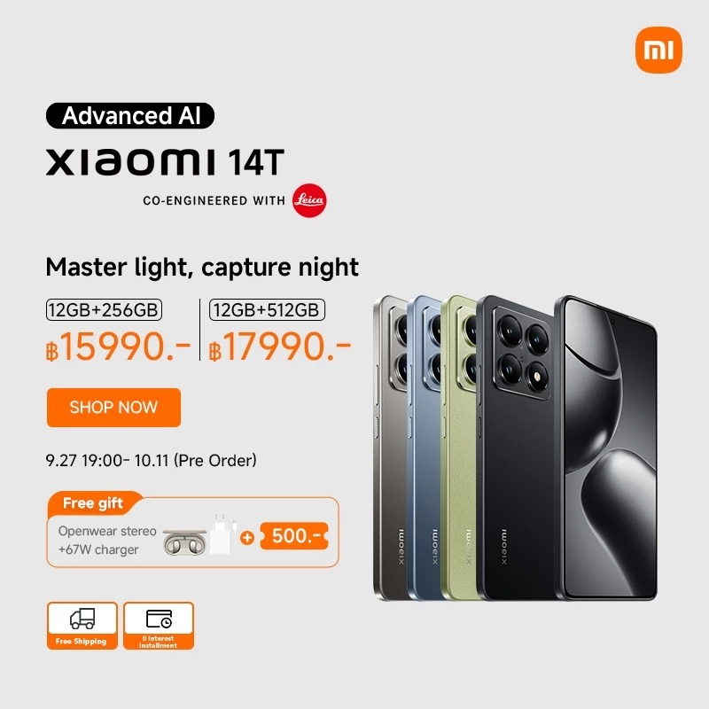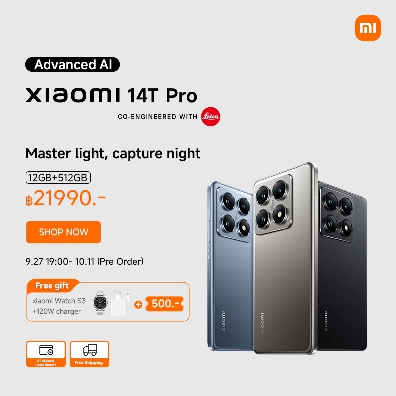 เสียวหมี่ ประเทศไทย เปิดตัวสมาร์ทโฟนเรือธงรุ่นใหม่ Xiaomi 14T Series ที่มีความโดดเด่นด้านการถ่ายภาพทั้งกลางวันและกลางคืนภายใต้คอนเซ็ปต์ ‘Master light, capture night’ อีกทั้งยังมาพร้อมเทคโนโลยี Advanced AI ที่ช่วยเสริมประสิทธิภาพการใช้งานได้ดียิ่งขึ้น โดย Xiaomi 14T Series พร้อมให้ผู้ที่สนใจเป็นเจ้าของได้แล้ววันนี้ โดยผู้ที่สั่งจองในระหว่างวันที่ 28 กันยายน – 11 ตุลาคม 2567 จะได้รับของสมนาคุณพิเศษ1