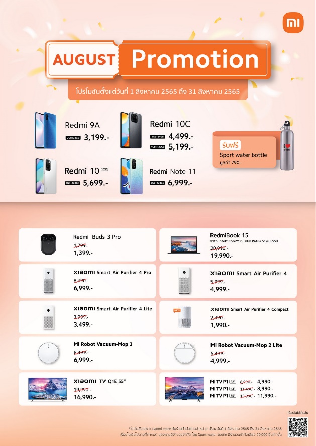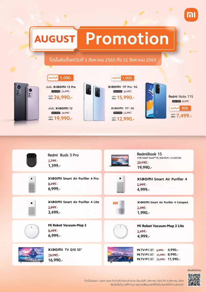 พบกับโปรโมชั่นพิเศษตลอดเดือนสิงหาคม ในระหว่างวันที่ 1 – 31 สิงหาคม 2565 ได้ที่ Xiaomi Store และร้านตัวแทนจำหน่ายที่ร่วมรายการทั่วประเทศ