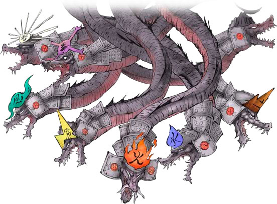 เมื่อโลกมนุษย์ถูกเจ้าอสูรร้ายตนนี้รุกราน ร้อนถึงเหล่าเทพเจ้าบนสรวงสวรรค์ตามปกรณัมของญี่ปุ่นที่ต้องลงมาปราบมัน แต่ทว่ามันสามารถต่อกรกับเหล่าเทพเจ้าได้อย่างไม่เกรงกลัว และเมื่อไม่มีเทพองค์ไหนสามารถกำราบความเหิมเกริมของมันได้ เทพแห่งวายุอย่าง “สุซาโนโอะ โนะ มิโคโตะ” (須佐之男命) จึงได้อาสาในการกำราบมัน แต่วิธีการของสุซาโนโอะเป็นเทพที่ไร้ซึ่งพลังคือการวางแผน “มอมเหล้า” เจ้าอสูรยักษ์นี่ สุซาโนโอะได้เดินทางมาที่หมู่บ้านแห่งหนึ่งและได้เครื่องบรรณาการเป็นหญิงสาวและสุรารอเอาไว้