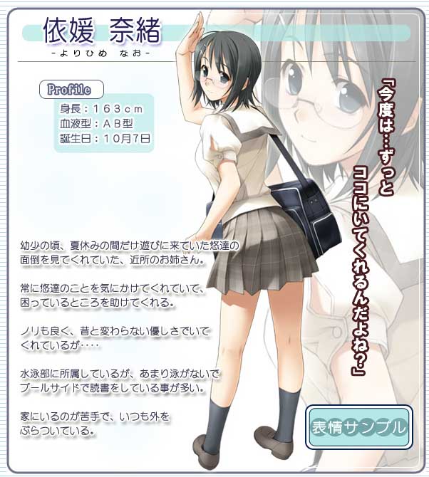สาวแว่นทรงโต ในบทของนาโอะนั้น (ตอนที่ 7กับ 8) เธอเป็นเพื่อนสมัยเด็กของฮารุ โซระและเรียวเฮย์ ซึ่งบ้านของเธออยู่ใกล้ๆ ข้างบ้านของฮารุกับโซระ มีนิสัยเป็นคนที่อ่อนหวาน น่ารักมารยาทดี เก่งงานบ้านการเรือน เป็นทั้งเพื่อนที่ดีต่อฮารุและเป็นพี่สาวที่คอยเอ็นดูต่อโซระ (อายุมากกว่าพวกฮารุหนึ่งปี) เธออาศัยอยู่กับครอบครัวที่มีคุณพ่อคุณแม่และตัวเธอรวมเป็นสามคน แต่เนื่องจากในช่วงเวลาในวัยโตที่เธอได้เติบโตมานั้น… คุณพ่อกับคุณแม่มักจะมีปากมีเสียงต่อกันอยู่เสมอ เธอจึงไม่ได้รับความสุขใดๆ จากคนภายในบ้าน