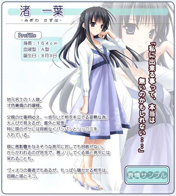 สาวผมดำยาว ในบทของคาซุฮะนั้น (ตอนที่3 กับ 4) เธอเป็นคุณหนูในตระกูลคาซุฮะ มีความสามารถทางด้านการเล่นวิโอล่า เธอจึงเป็นความภาคภูมิใจของวงศ์ตระกูลอย่างมาก ตัวเธอมีความสนิทชิดเชื้อกันกับอากิระ ที่เป็นเพื่อนร่วมชั้นเรียน ซึ่งในความจริงแล้วนั้น ทั้งสองคนเป็นพี่น้องคนละแม่กัน เธอได้ล่วงรู้ความจริงที่ว่า คุณพ่อของเธอเองเคยมีภรรยาที่นอกเหนือจากคุณแม่ของเธอ จนมีลูกสาวด้วยกัน แต่กลับไม่รับผิดชอบอะไรต่อลูกสาวคนนั้น ซึ่งลูกสาวอีกคนนั้นก็คือ อากิระนั่นเอง….