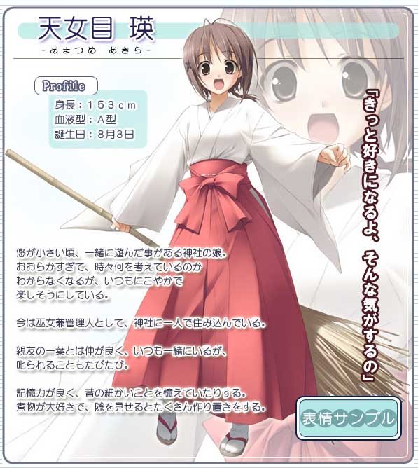 เมื่อภายหลังจากที่คุณปู่ของเธอเสียไป… เธอต้องอาศัยอยู่เพียงตัวคนเดียวที่ศาลเจ้าบนภูเขาของเมืองนี้ ความจริงแล้วเธอเป็นลูกสาวต่างมารดาที่ไม่ได้ตั้งใจให้เกิดขึ้นมา และเธอเองยังมีศักดิ์เป็นพี่สาวของมิกิวะ แม้จะไม่ได้เกิดจากคุณแม่คนเดียวกัน… แต่มิกิวะก็รักเธอเหมือนคนในครอบครัวคนหนึ่ง และพร้อมที่จะทำทุกๆ อย่างเพื่อพี่สาวตัวน้อยๆ คนนี้