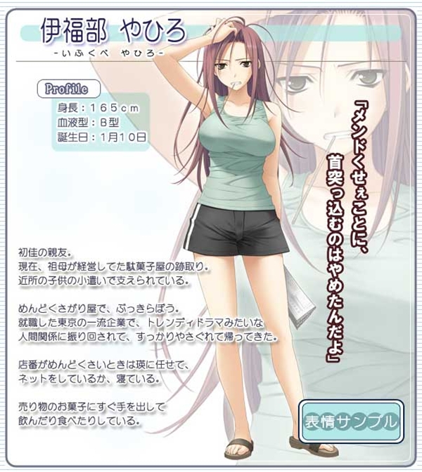 สาวสวยมาดเซอๆ เธอเป็นเพื่อนที่สนิทที่สุดของโมโตกะ เธอญาติของอากิระ เปิดร้านขายของอยู่ใกล้ๆ กับศาลเจ้าที่อากิระอาศัยอยู่ ภายหลังจากที่อากิระเหลือตัวคนเดียว เธอเองก็พยายามช่วยเหลืออากิระอยู่เสมอ แม้ว่าอีกฝ่ายจะไม่อยากเป็นภาระของคนอื่นก็ตาม